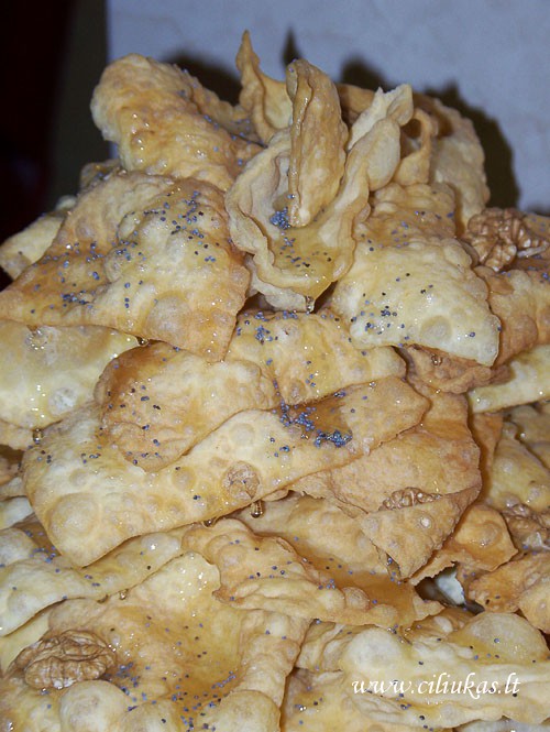 Iškočioti labai labai plonai, popieriaus plonumo. Supjaustyti norimo dydžio gabaliukais ir virti karštame aliejuje. Į aliejų nepamiršti įpilti degtinės ar spirito.